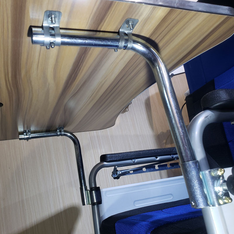 – Khóa cố định khung bàn ăn với xe lăn được thiết kế chắc chắn với chất liệu thép cho bàn được cố định chắc chắn hơn. Không giống như một số bàn trên thị trường bằng chất liệu nhựa.