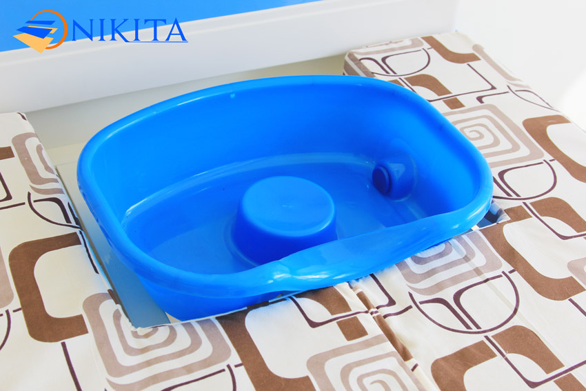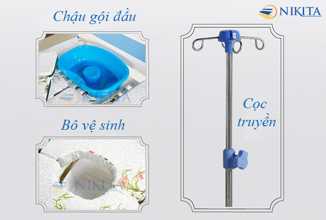 • Bô vệ sinh: Sử dụng tay gạt để điều khiển bô vệ sinh, một tấm đệm trên giường sẽ dần tụt xuống, cùng lúc giá bô dưới gầm giường chuyển động tịnh tiến vào. Bô và tấm đệm khoét lỗ chuyển động đều ngược chiều; sẽ dừng lại khi bô bao trọn lỗ khoét trên đệm. Bệnh nhân đi vệ sinh xong, điều khiển cho bô và đệm về vị trí ban đầu; sau đó đem chất thải đi đổ.