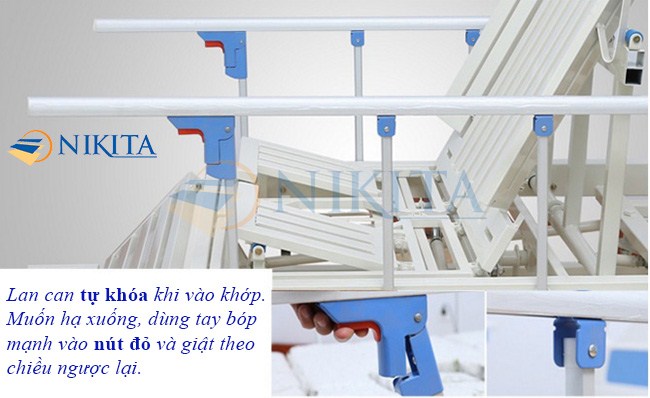 • Thanh chắn 2 bên giúp bảo vệ người bệnh tránh bị rơi xuống đất. Ngoài ra, có thể gấp gọn đơn giản bằng cách ấn vào nút đỏ trên thành và gập lan can về phía trước.