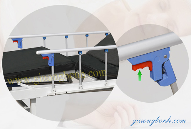 • Thanh chắn giúp bảo vệ người bệnh tránh bị rơi xuống đất. Ngoài ra, có thể gấp gọn đơn giản bằng cách ấn vào nút đỏ trên thành và gập lan can về phía trước.