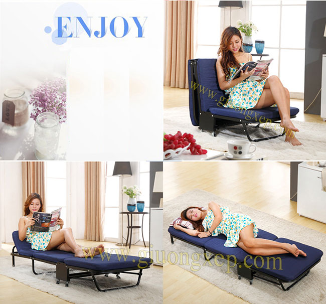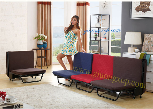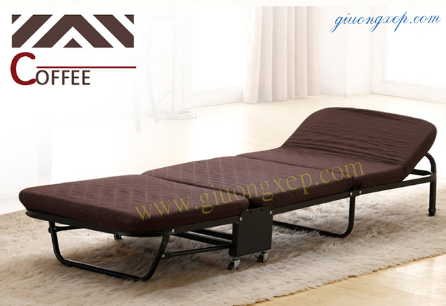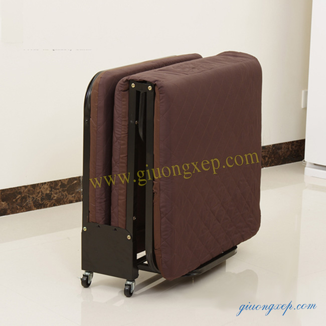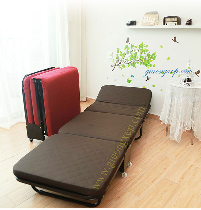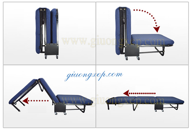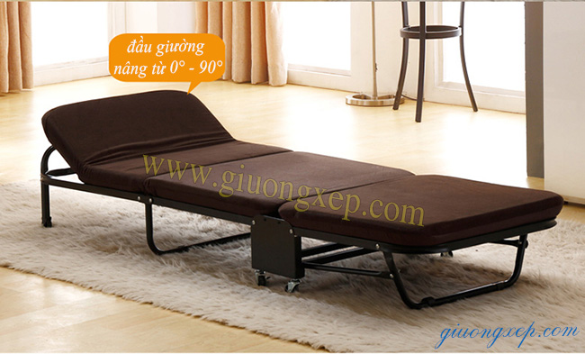 Giường xếp di động nâng đầu có phần khung làm bằng thép sơn tĩnh điện, nối với nhau bằng bản lề nên có thể gấp gọn.
