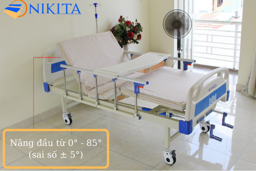 – Tay quay thứ nhất: Tác dụng chuyển bệnh nhân từ tư thế nằm thành tư thế ngồi, góc ngồi tối đa 85 độ. Trong khoảng từ 0 – 85 độ có thể cho người bệnh nằm cao đầu ở bất kỳ điểm nào. Tính năng nâng cao đầu người bệnh của NKT-DCN02 giúp người bệnh đỡ mỏi, khi dựng dậy ăn hay uống thuốc rất dễ dàng cho cả người bệnh và người chăm sóc.