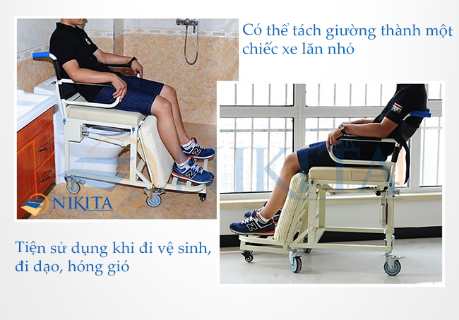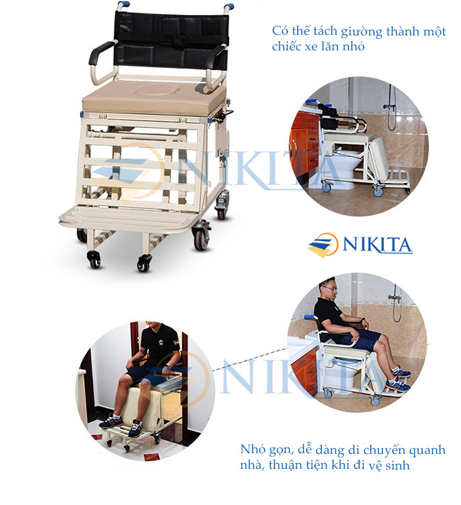 – Giường bệnh NKT-DCN09 còn có thể tách phần chân và bô vệ sinh ra thành một chiếc xe lăn độc lập, tiện di chuyển trong nhà.