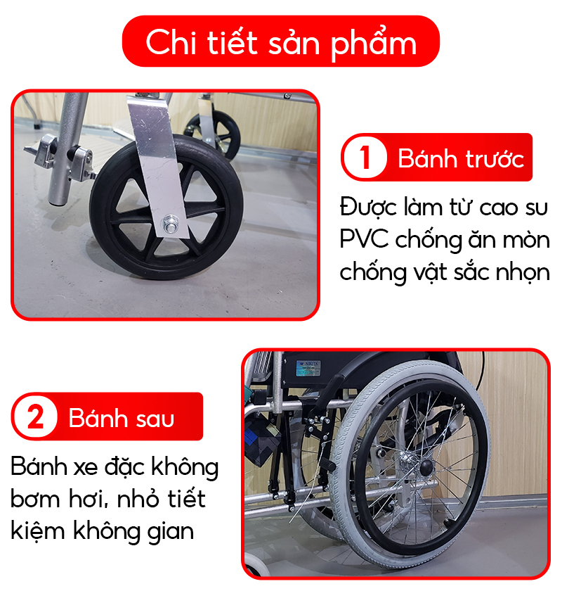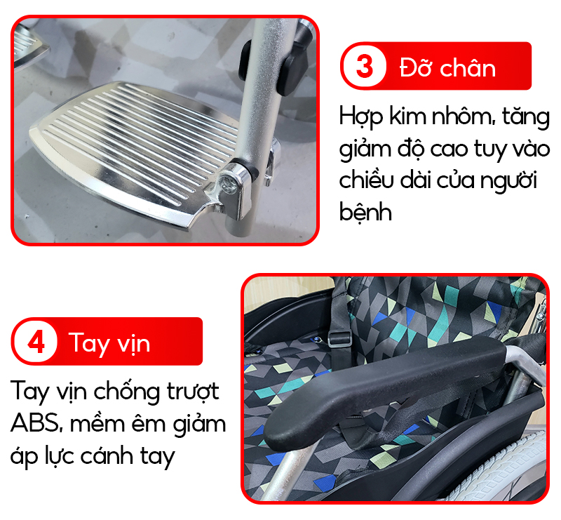 Thiết kế đỡ chân linh hoạt có thể nâng lên hạ xuống, đẩy ra và kéo vào nên phù hợp với mọi người bệnh dù cao hay thấp vẫn có thể ngồi thoải mái.